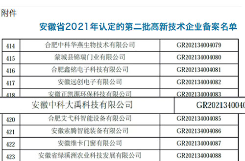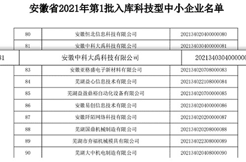 • 入選安徽省2021年第一批入庫(kù)科技型中小企業(yè)