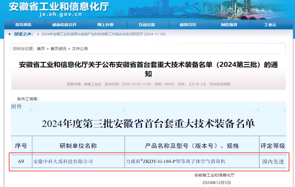 • 力康盾?ZKDY-G-180-P型等離子體空氣消毒機(jī)入選2024年度第三批安徽省首臺(tái)套重大技術(shù)裝備,評(píng)定等級(jí):國(guó)內(nèi)先進(jìn)